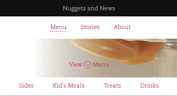 On scroll the primary navigation collapses down to a chicken sandwich menu icon.