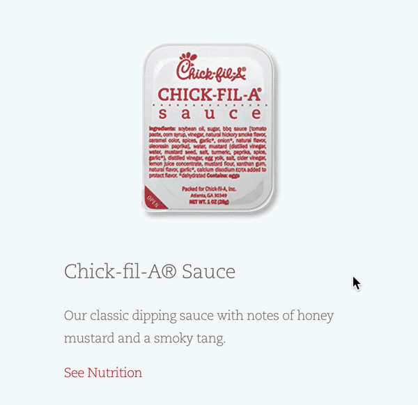 Chick-fil-A wanted to create an authentic experience avoiding overly aspirational beauty shots of the food and condiments. This sauce hover state lets guests interact with each sauce packet as they would in a restaurant and let's them see both the packaging and the sauce inside.